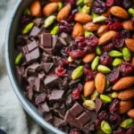 - In a large mixing bowl, combine the chopped almonds, pumpkin seeds, pistachios, dried cherries or cranberries, and dark chocolate chips. Stir gently to ensure every ingredient is evenly distributed.