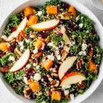 A vibrant salad celebrating autumn’s bounty with roasted butternut squash, tart cranberries, crunchy walnuts, and creamy feta cheese.
