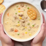 A comforting soup inspired by the classic flavors of Shepherd’s Pie, combining tender beef, vegetables, and creamy mashed potatoes in a warm, cozy bowl.